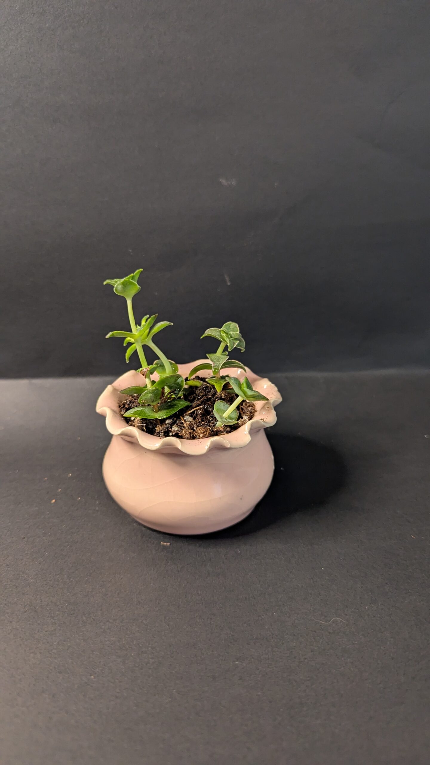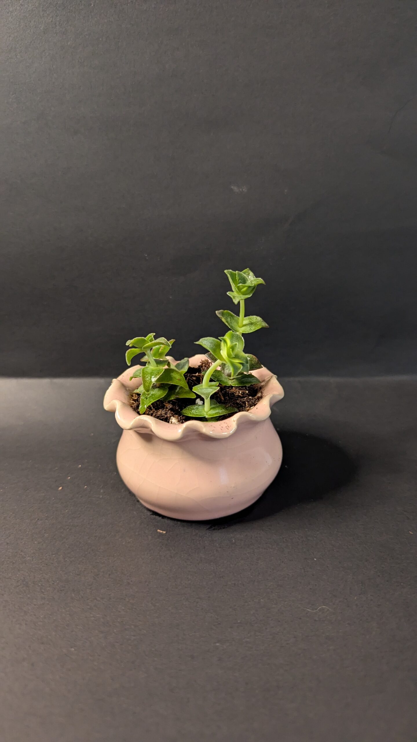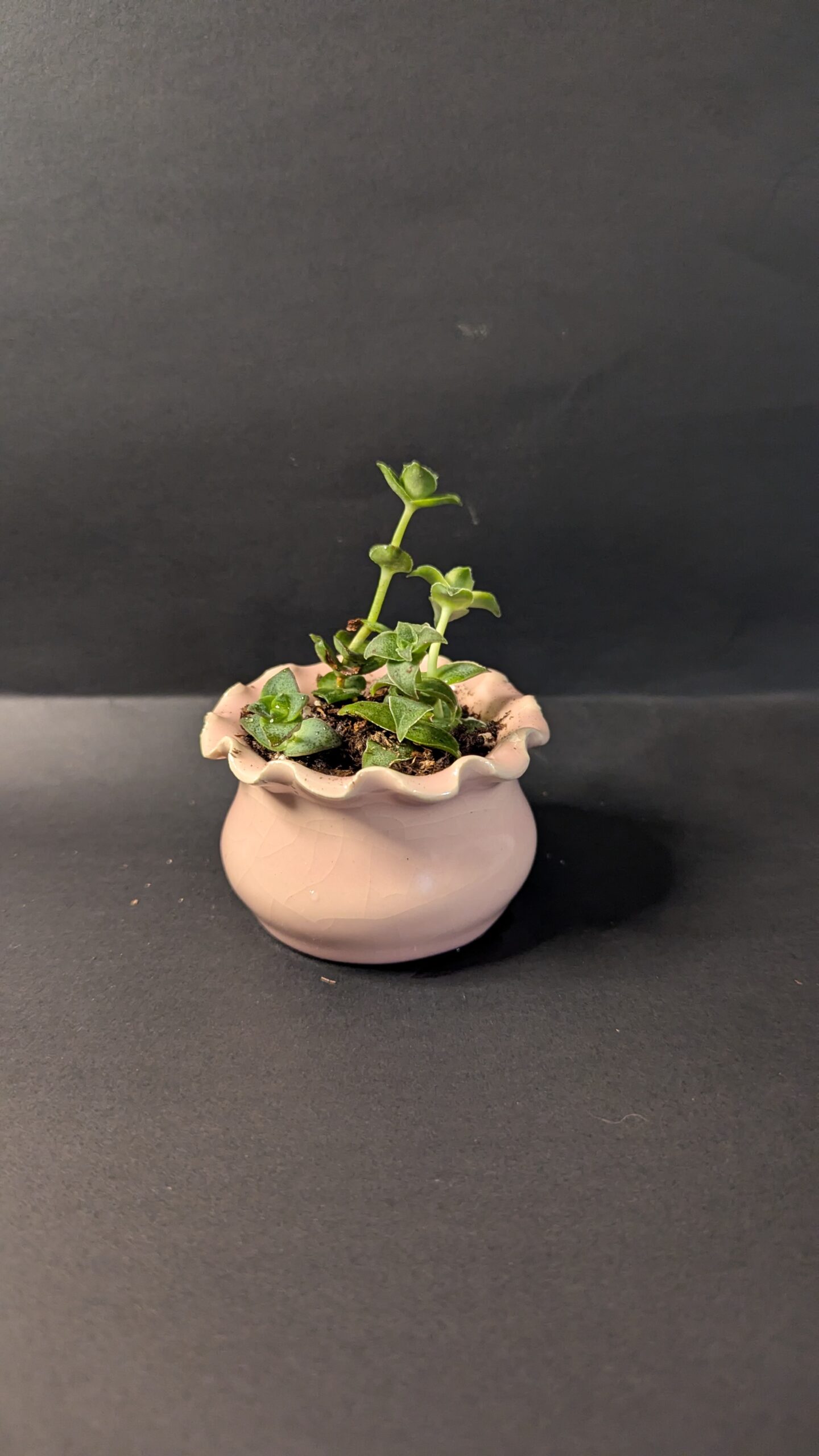 This small pink pot features a soft, wavy lip that flows gently around the top. Inside, a Golden Sedum with plump green leaves and red tips adds a lively touch perfect for any space. Plant: Golden Sedum Light: Bright indirect to partial sun Water: Every 2–3 weeks in Colorado; let soil dry fully between waterings